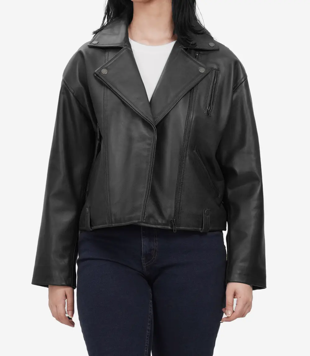 Unleash your inner rebel with the Black Oversized Leather Jacket, crafted from 100% real lambskin leather for that rich, buttery-soft feel. Its oversized silhouette and edgy asymmetrical front zipper bring a bold, fashion-forward attitude to your everyday look.